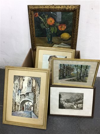 Cartone contenente nove quadri di soggetto, tecnica e autori differenti, in cornici (difetti)