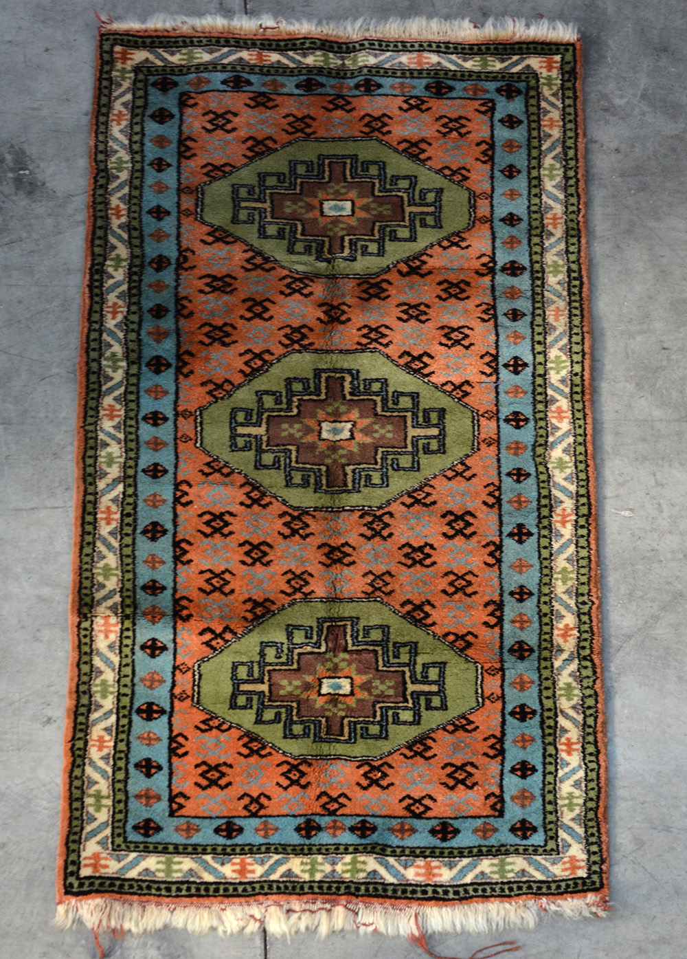 Tappeto Samarcanda, Turkestan orientale, secolo XX. Disegno a tre medaglioni verdi su fondo salmone (cm 140x80) (difetti)