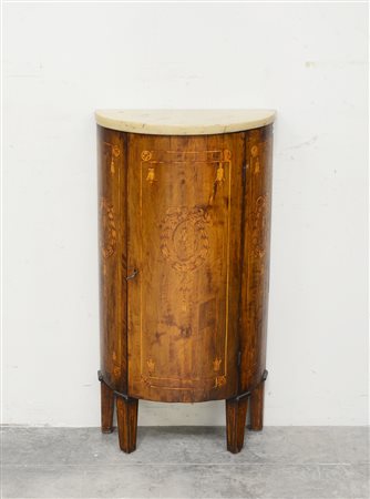 Piccolo mobile a demilune decorato con filettature e piccoli intarsi, piano in marmo (cm 49x93x25) (difetti)