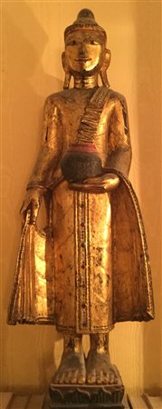 Scultura raffigurante divinità in legno dorato con applicazioni di strass in vetro, basamento in legno ebanizzato (h statua cm 67) (difetti)