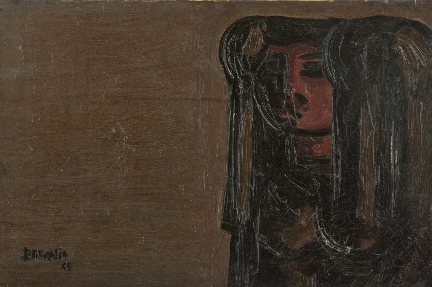 Xante Battaglia Figura, 1965 Olio su tela, cm. 40x60 Leggera craquelure sulla superficie pittorica. Firma e data in basso a sinistra. Sul verso: dedica a persona.