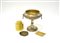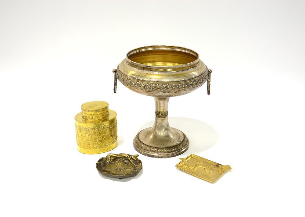 Lotto composto da un’alzata biansata in metallo argentato, un tea caddy in metallo dorato e due posaceneri in bronzo (difetti)