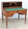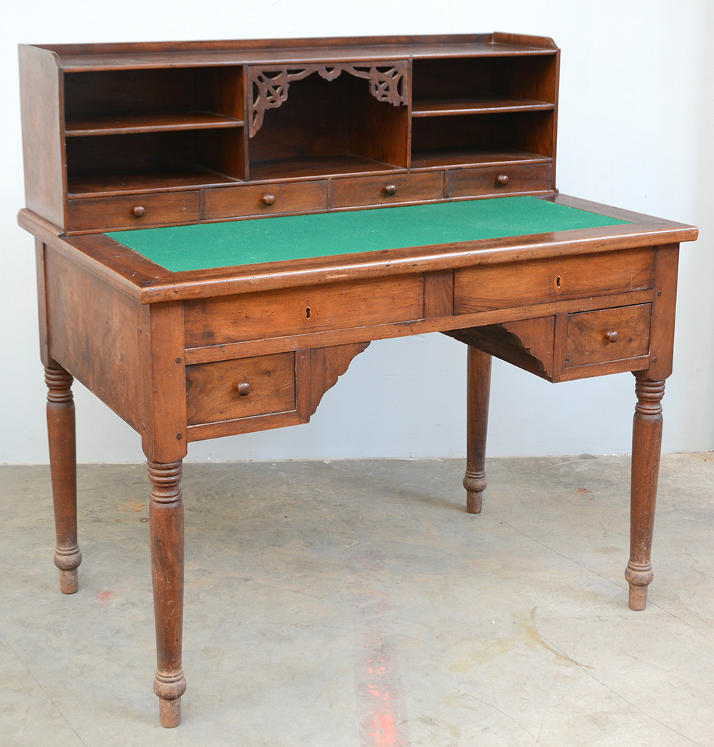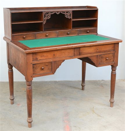Scrivania da centro a quattro cassetti con alzata cn vani a giorno e quattro cassetti in linea. Gambe tornite. Panno rivestito in panno verde (cm 113x114x73) (difetti)