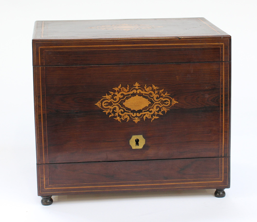 Portaliquore con cassa in legno intarsiata e filettata in legno chiaro, piedi torniti ebanizzati, contenente bottiglie e bicchierini (cm 30x26x22) Secolo XIX (difetti)
