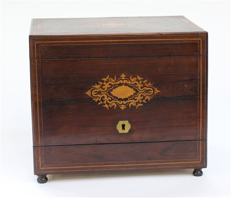 Portaliquore con cassa in legno intarsiata e filettata in legno chiaro, piedi...