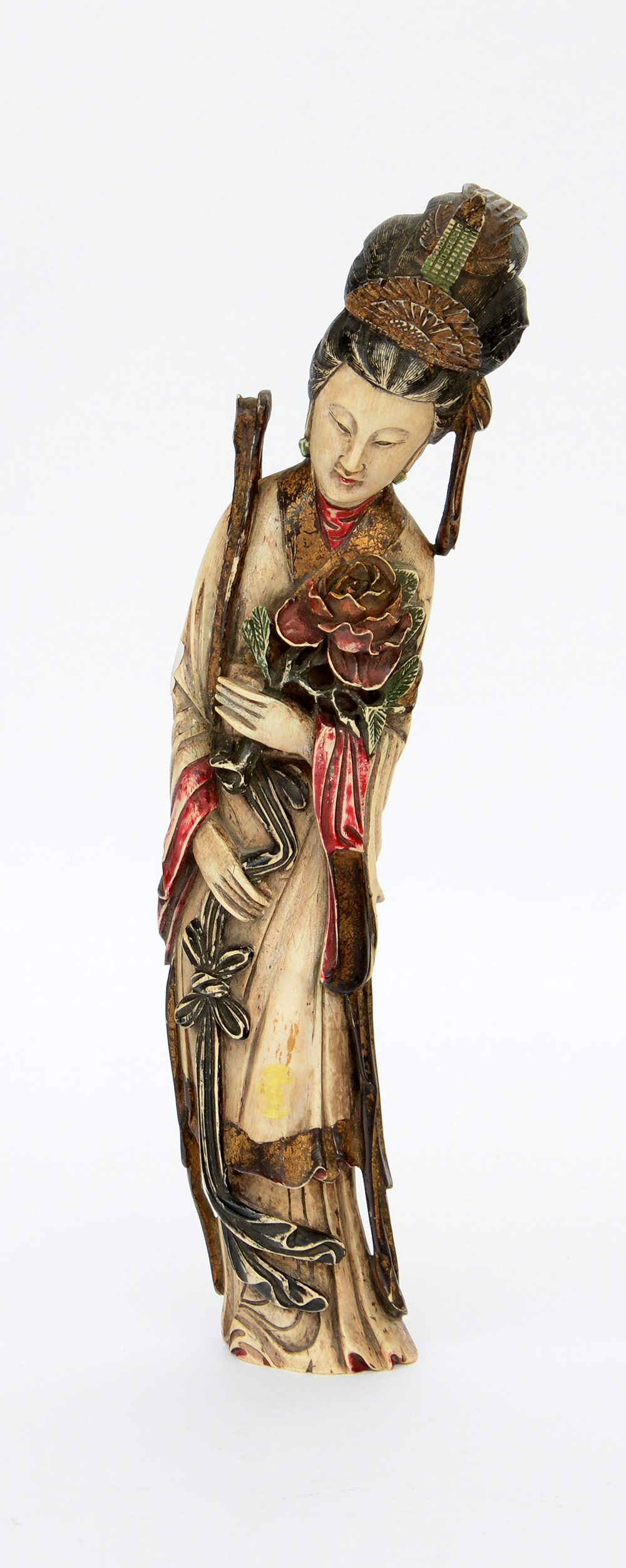 Dama con ramo di fiori (h. 40 cm.) in avorio colorato(difetti) Cina, inizio sec. XX