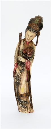 Dama con ramo di fiori (h. 40 cm.) in avorio colorato(difetti) Cina, inizio...