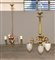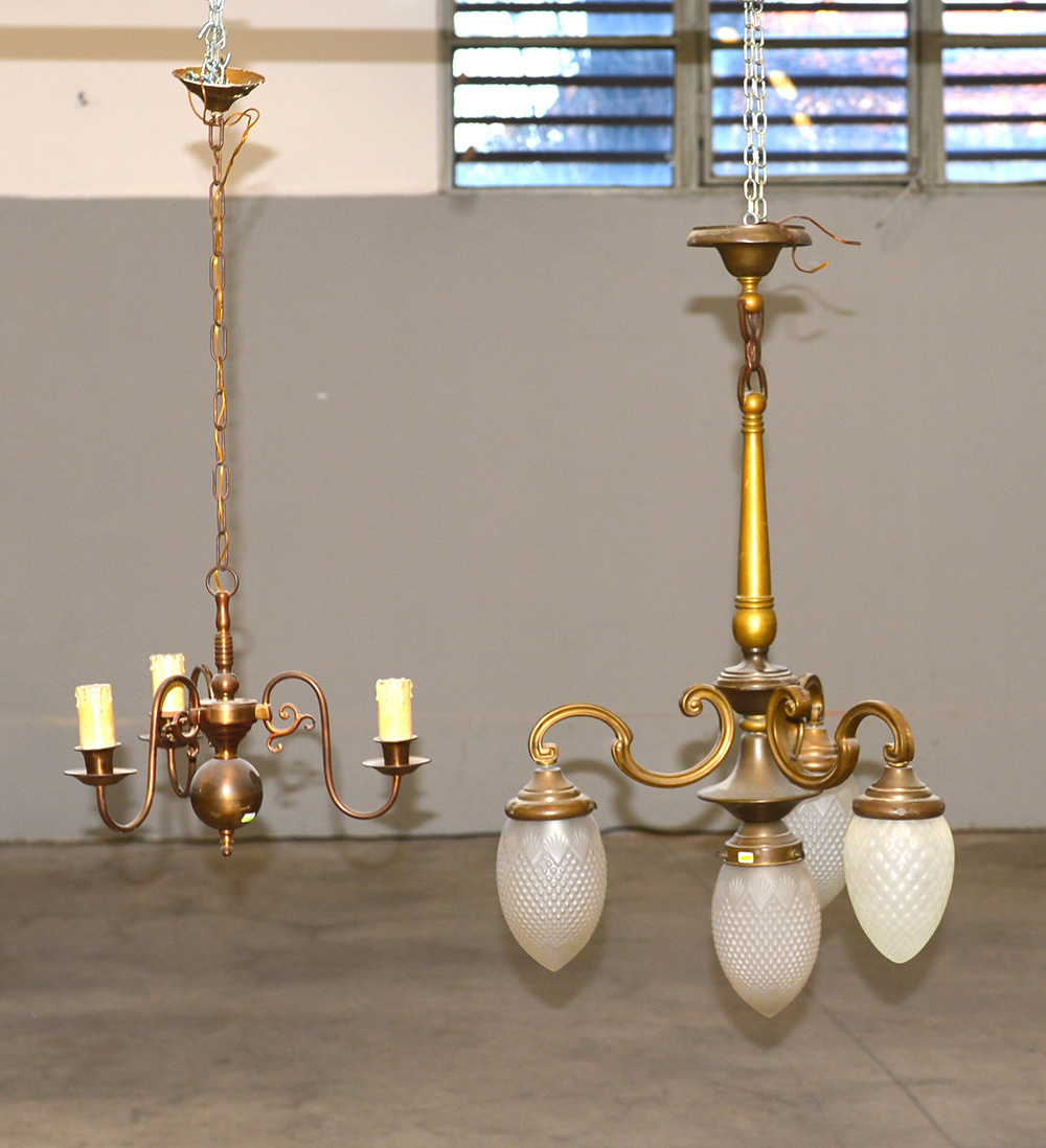 Lotto composo da un lampadario a quattro luci in bronzo con paralumi in vetro satinato ed uno a tre fiamme in ottone, decori, misure ed epoche diverse (difetti)