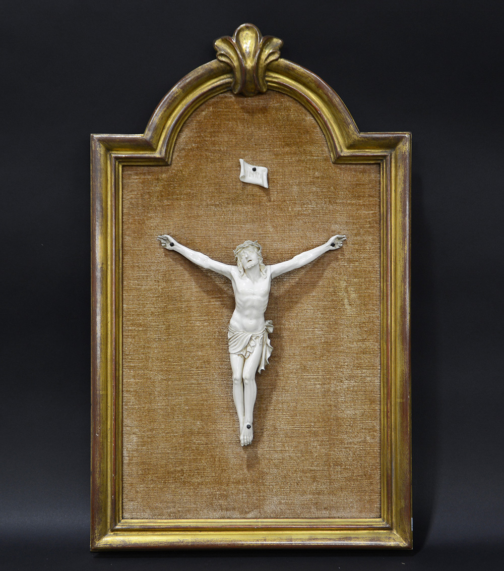 Scultura in avorio raffigurante Cristo crocefisso montato su pannello incorniciato (scultura cm 26) (lievi difetti)