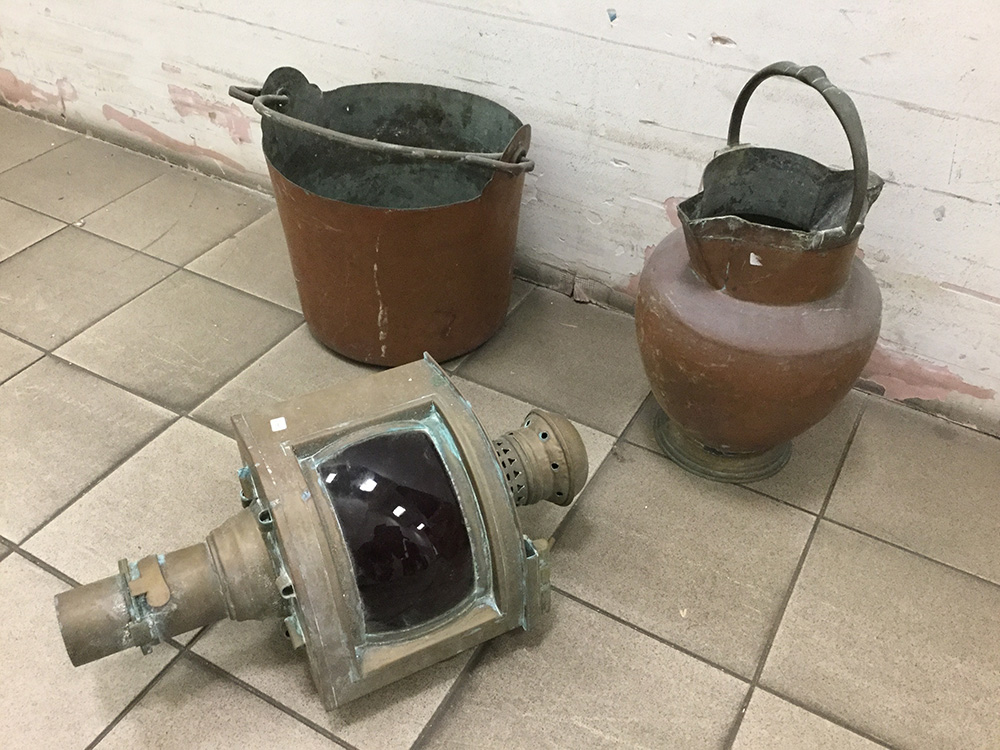 Lotto composto da una lanterna da carrozza, un versatoio e un paiolo in rame (difetti)