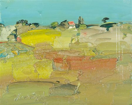 Sergio Scatizzi Terre d'estate Olio su tavola, cm. 40x50 Firmato in basso a sinistra. Sul verso: firma. Autentica dell'Artista su foto con etichetta, firma e timbro a secco dell'Archivio "Studio d'Arte Moderna Il Fiore", Montecatini Terme. L'Opera è archiviata con il codice OEORIOOM-0000RET.