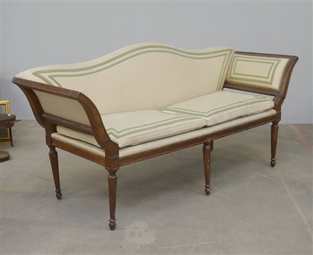 Divano a tre posti in noce con braccioli e schienale mossi, rivestimento con...