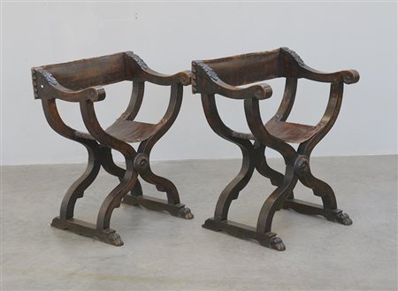 Coppia di poltroncine Savonarola con braccioli scolpiti a motivi vegetali, seduta e schienale in cuoio, piedi a zampa ferina (difetti)