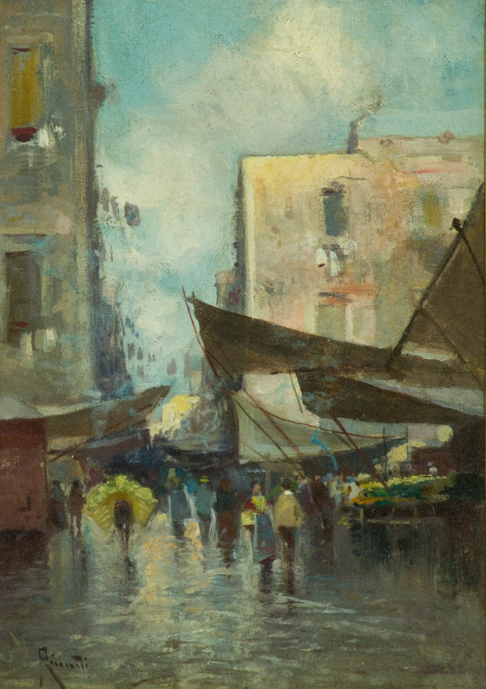 Oscar Ricciardi Mercato a Napoli, fine '800 Olio su tela, cm. 26,5x19 Firmato in basso a sinistra. Bibliografia: Giulio Bolaffi " Catalogo della pittura Italiana dell' '800, n° 11", pag. 201. Scritto di Autenticità di Paolo Stefani, su foto.