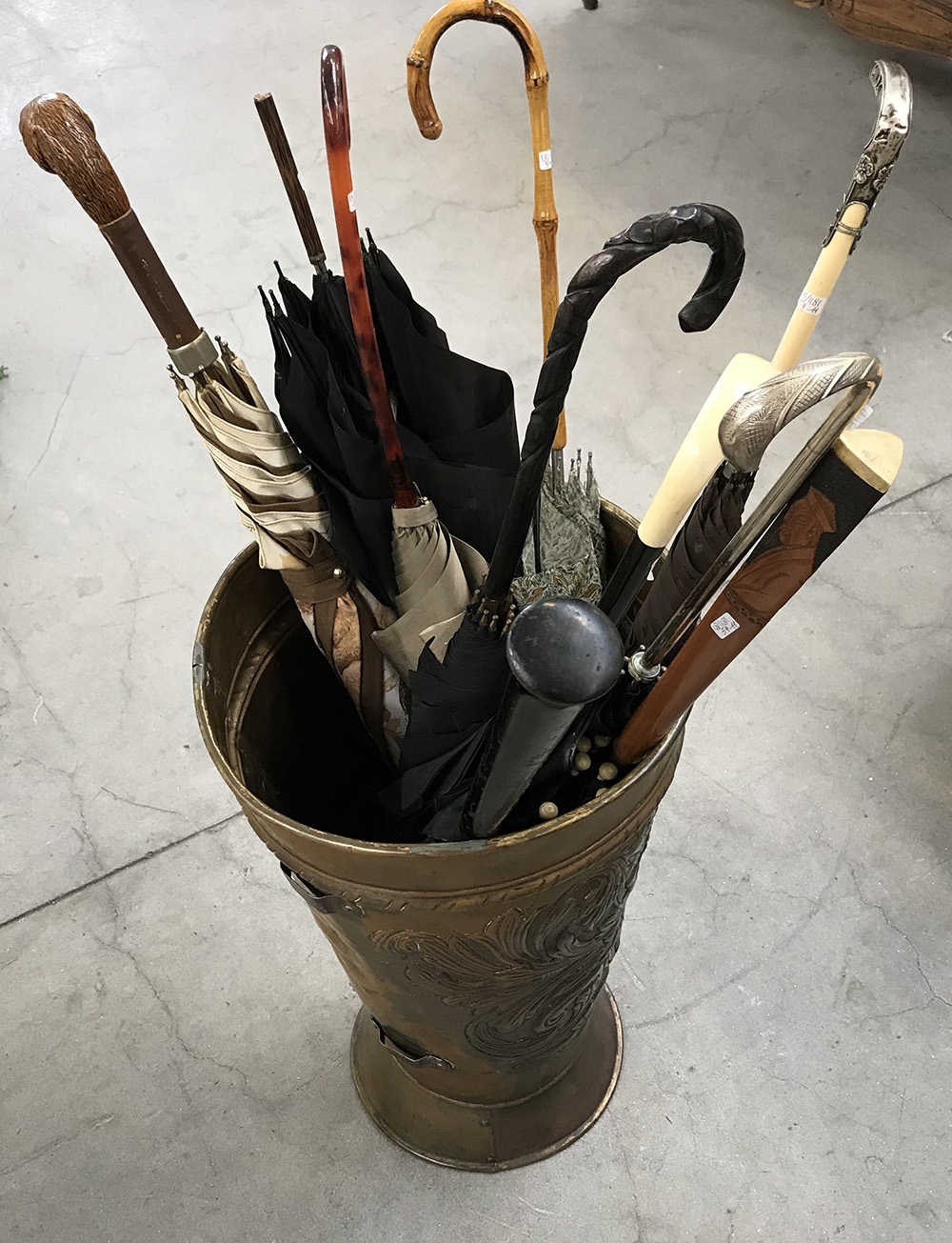 Lotto composto da un portaombrelli in rame contenente 10 ombrelli per signora di fatture differenti (difetti e mancanze)