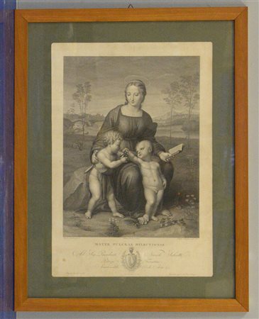 R.Morghen (1758-1833) "Mater pulcrae dlectionis", da "La Madonna del Cardellino" di Raffaello, incisione (cm 49x33). In cornice (difetti)