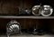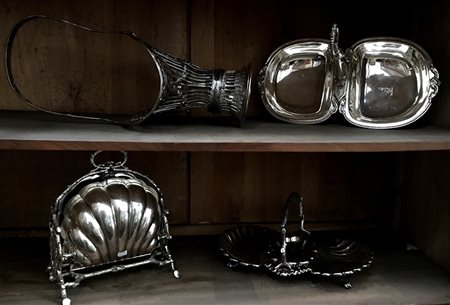 Lotto composto da una biscottiera, due alzatine e un cestino in metallo argentato (difetti)