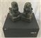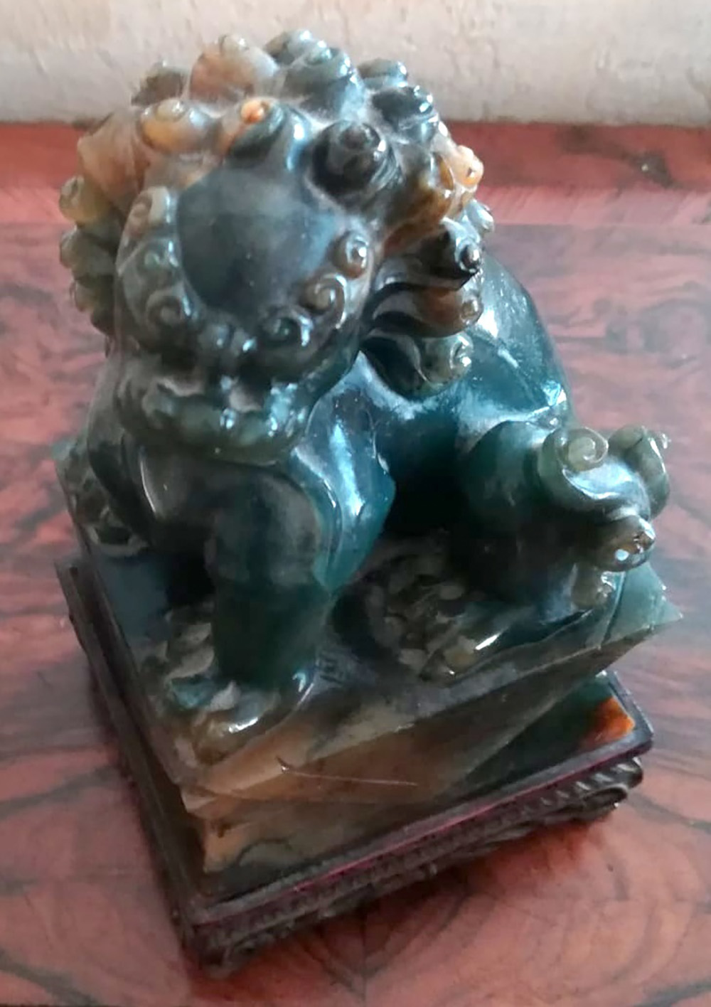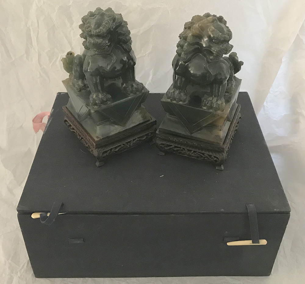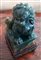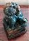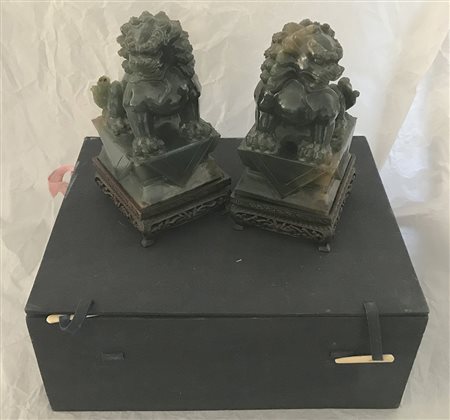 Coppia di leoni buddhisti in pietra dura di colore verde con base in legno (h tot cm 17) (lievi difetti)