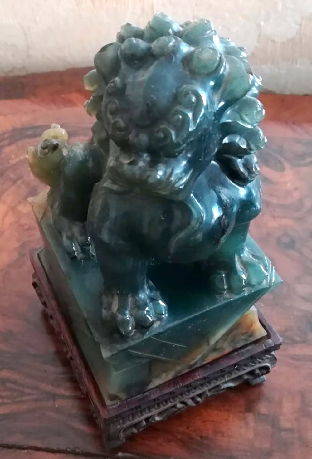 Coppia di leoni buddhisti in pietra dura di colore verde con base in legno (h...