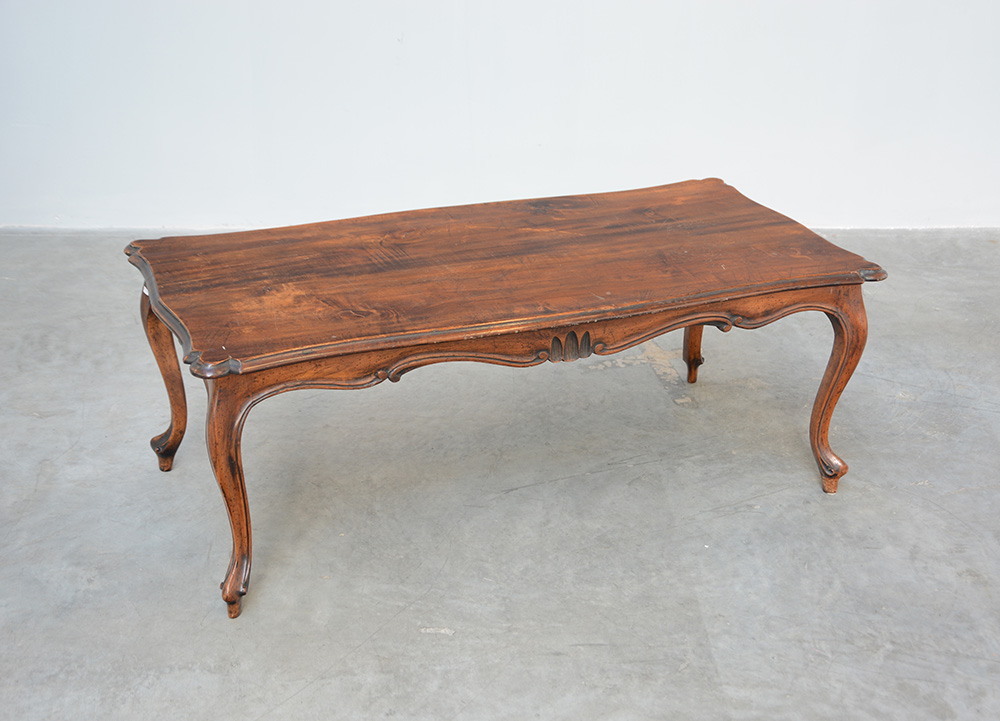 Tavolino da salotto rettangolare a tinta scura con gambe mosse (cm 118x44x60) (difetti)