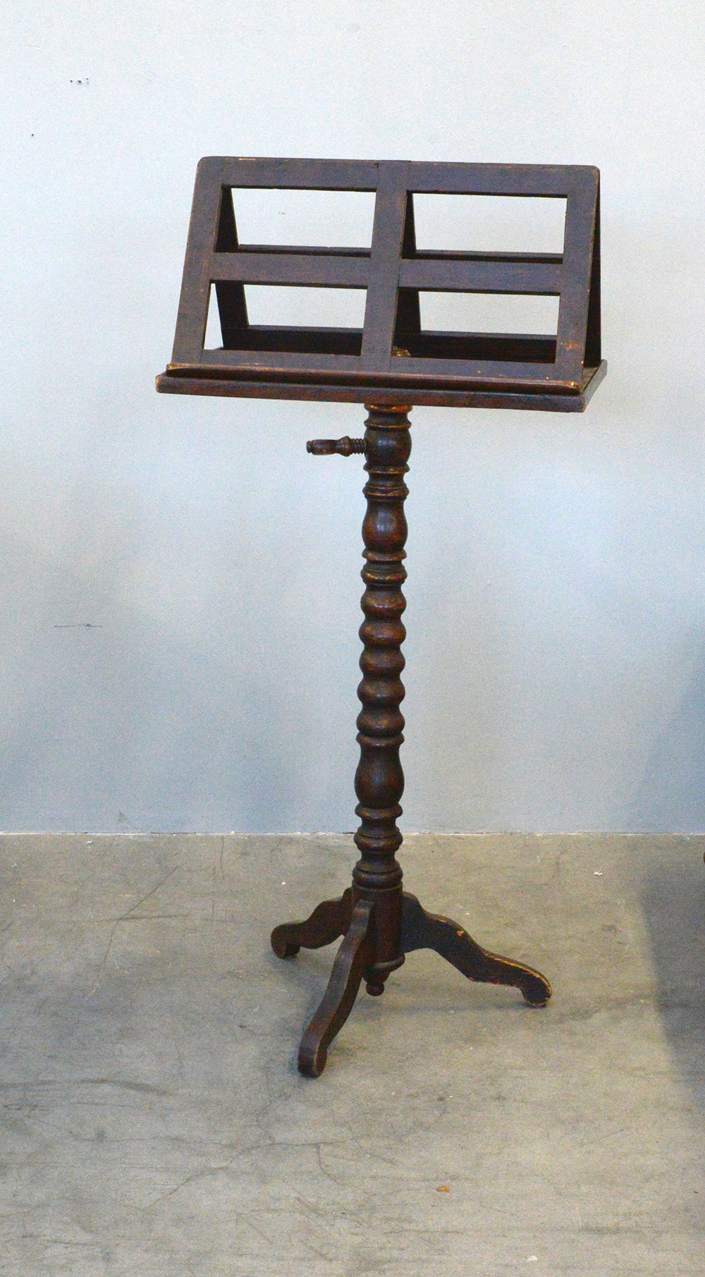 Leggio tripode con fusto in legno tornito con porta spartiti doppio. Secolo...
