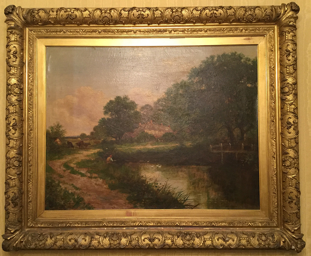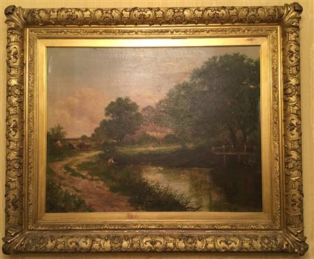 "Paesaggio agreste con laghetto" olio su tela (cm 71x92) Firmato in basso a sinistra. In cornice dorata
