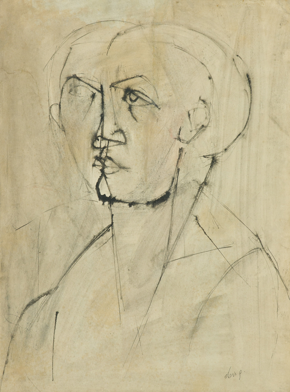 Gianni Dova Figura China e carboncino su carta applicata su tavola, cm. 60x45 Firmato in basso a destra. Sul verso: etichetta e timbro "Galleria La Cupola", Montecatini Terme; Timbro "Galleria Ghelfi", Verona.