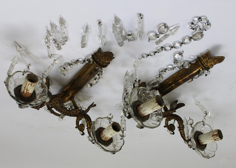 Coppia di applique a due luci con pendagli in cristallo (h cm 30 ca) (difetti e mancanze)