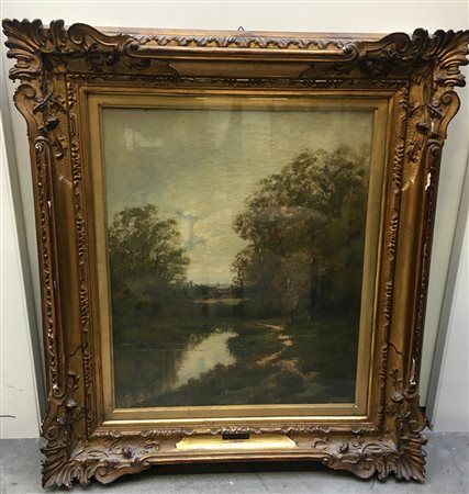 "Paesaggio boschivo" olio su tela (cm 55x46) Firmato in basso a destra. In cornice (difetti)