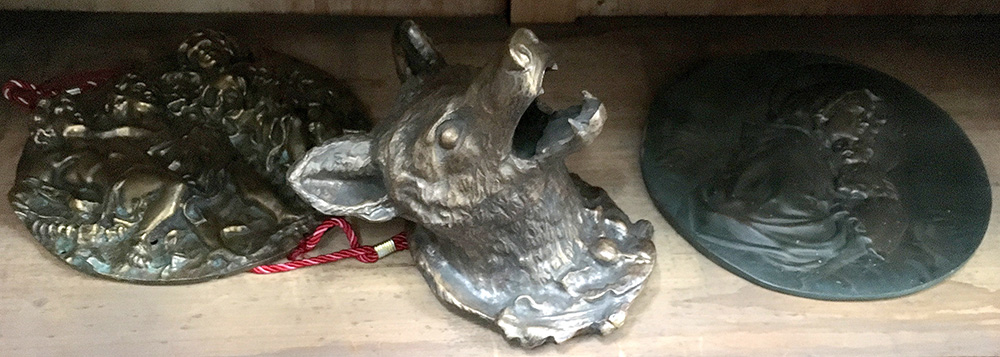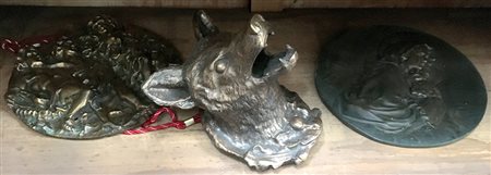 Lotto composto da due tondi in bronzo e rame ed una testa di volpe in bronzo