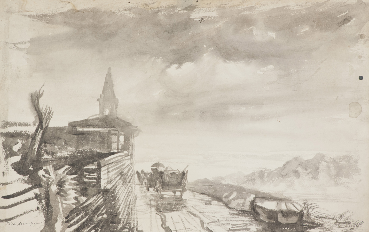 Pietro Annigoni Paesaggio inglese China acquerellata su cartoncino, cm. 36x56 Firma in basso a sinistra, sigla in basso a destra. Autentica dell'Artista su foto.