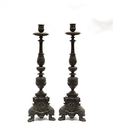 Coppia di candelieri in bronzo decorati a motivi religiosi e ritratti entro...