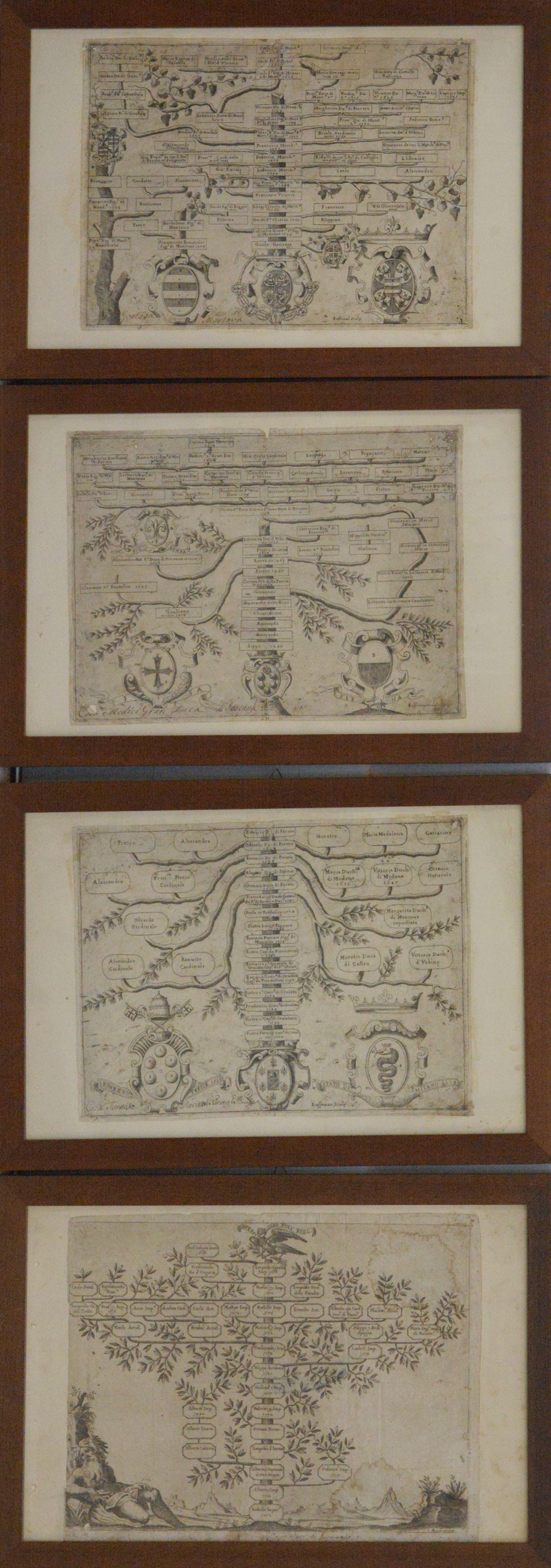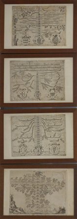 Gruppo di quattro stampe raffiguranti alberi genealogici (cm 29x40), in cornice. (Difetti)