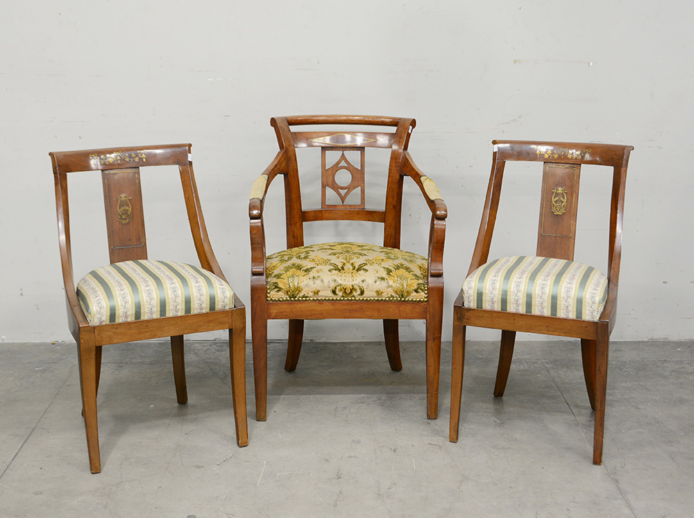 Lotto composto da una poltrona e una coppia di sedie intarsiate in ottone, secolo XIX (difetti)