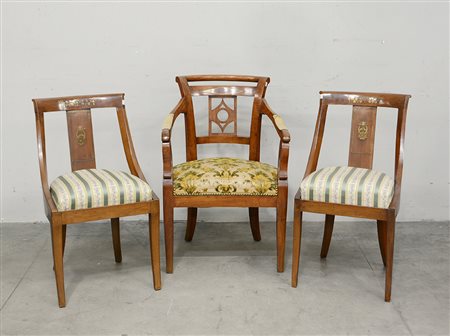 Lotto composto da una poltrona e una coppia di sedie intarsiate in ottone,...