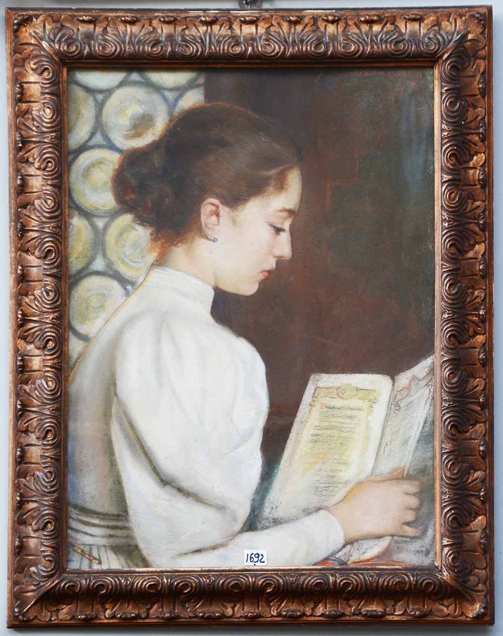 "La lettura" pastelli colorati su carta (cm 60x45) Firmato e datato 1897 in alto a destra. In cornice (difetti)