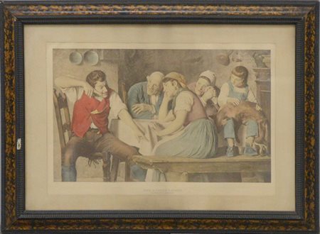 Acquatinta inglese del secolo XIX raffigurante una scena d'interno (cm 40x60) In cornice ebanizzata��(difetti)