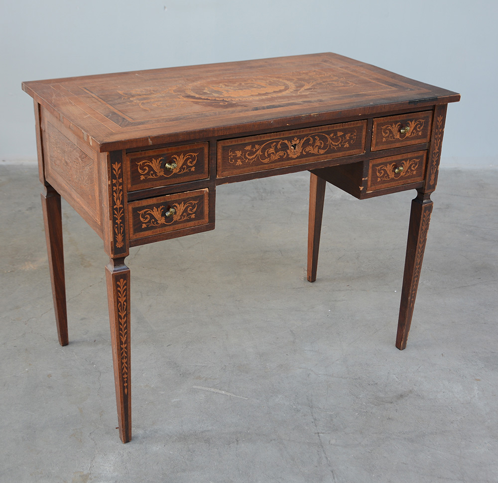Tavolo scrittoio con fronte e fianchi intarsiati a volute e putti. Gambe rastremate (cm 100x80x49)��(difetti)