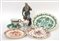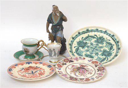 Lotto composto da tre piatti tondi, due tazzine con piattini e una statuetta...