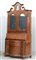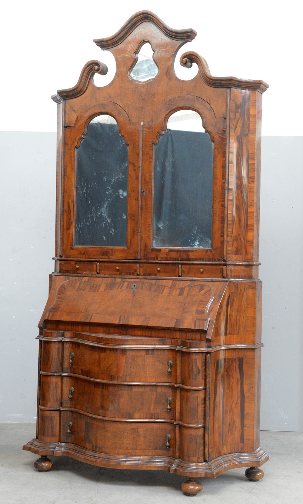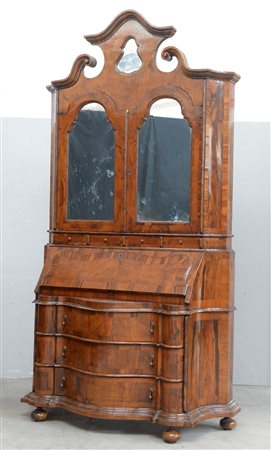 Mobile a due corpi lastronato in noce e radica di noce; parte inferiore a tre cassetti su fronte mossa e ribalta celante cassettini e vani a giorno, parte superiore a due battenti centinati centrati da specchi, cimasa mossa con profilo spezzato (cm 141x260x55) (lievi difetti)
