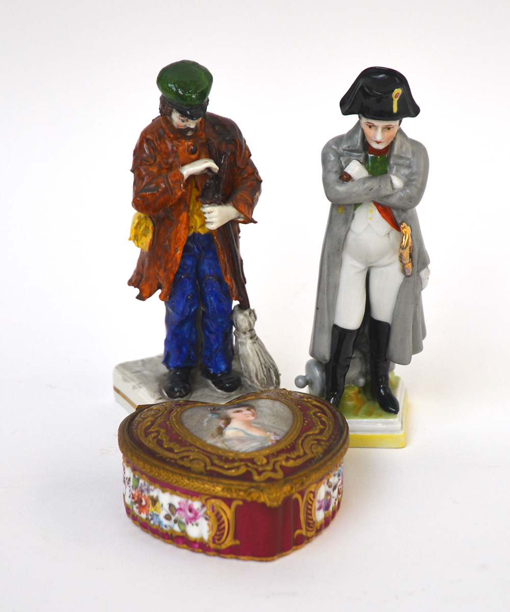 Lotto composto da una scatolina a forma di cuore decorata con figura femminile e due statuettea soggetti diversi in porcellana (difetti)