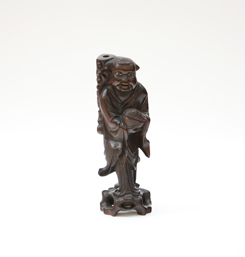 Scultura lignea raffigurante figura leggendaria del monaco ridente con occhi in vetro e denti in osso. Cina, secolo XX (h. cm 29)