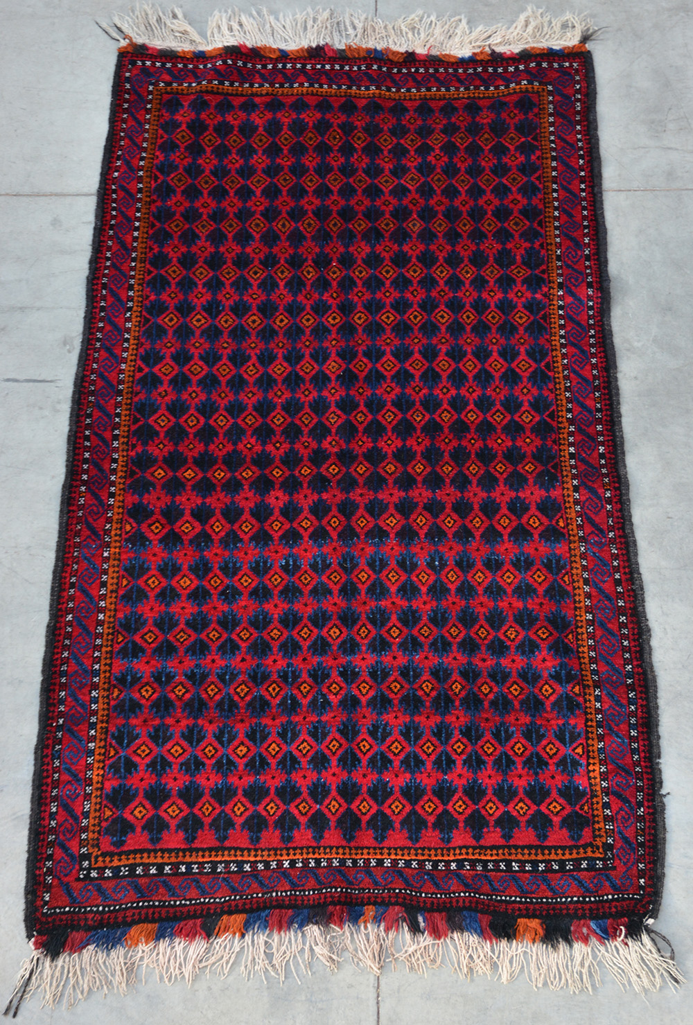 Tappeto Afghan, Turkestan occidentale, secolo XX. Disegno geometrico nei toni del blu, azzurro e arancio su fondo rosa shocking (cm 210x120) (difetti)