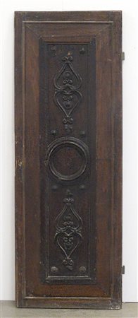 Antico portoncino a un battente riquadrato e decorato da pannello scolpito a motivi vegetali e rosone (cm 200x70). (Difetti)