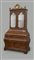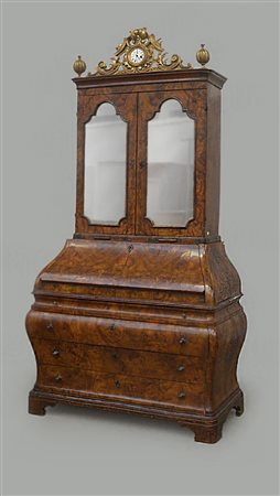 Antico trumeau lastronato in radica di noce di forma mossa e bombata. Parte inferiore a quattro cassetti con anta ribaltabile. Parte superiore a due ante con specchi di forma sagomata. Sormontato da cimasa in legno dorato scolpita a volute e centrata da orologio (cm 117x230x56) (difetti e restauri)