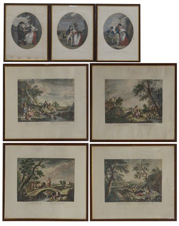 Lotto composto da quattro stampe a colori raffiguranti scene di genere all'aperto e tre raffiguranti scene galanti. Misure diverse, in cornice. (Difetti)