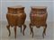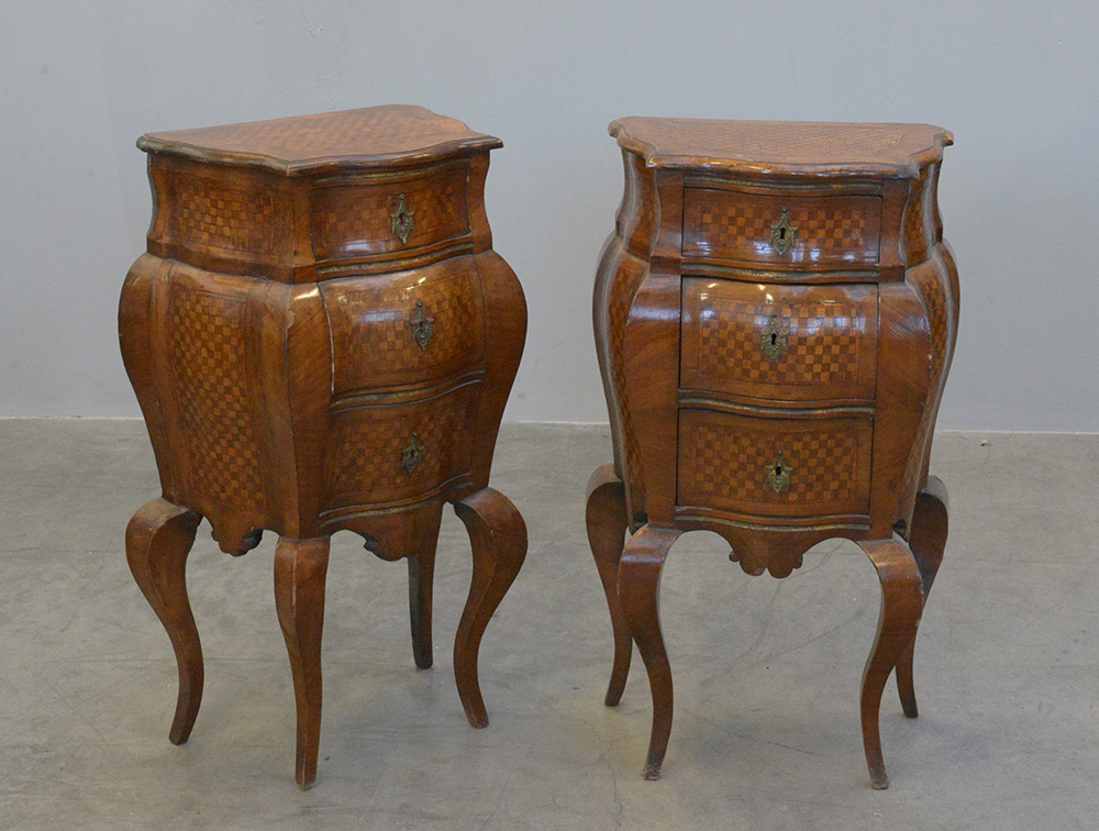 Coppia di comodini a tre cassetti di forma sagomata interamente intarsiati a marquetterie. (Difetti).