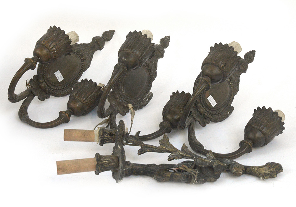 Lotto composto da tre appliques a due luci in rame sbalzato e un'applique in bronzo dorato decorata a motivi fogliati (difetti)