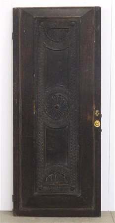 Antico portoncino a un battente con pannello centrale riquadrato da sagome e scolpito a motivo geometrico ripetuto e rosone centrale (cm 193x80). (Difetti)