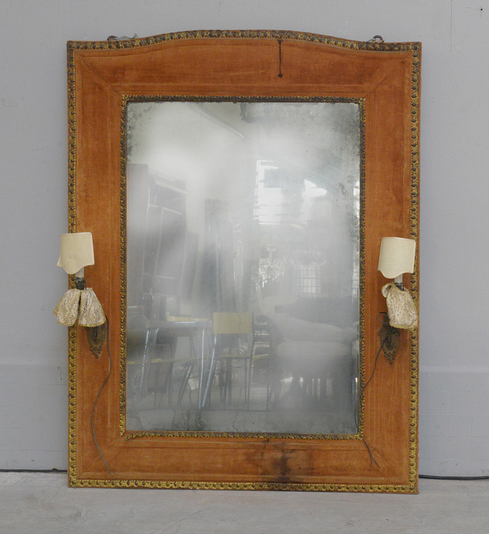 Specchiera rivestita in velluto ocra con doppio profilo di metallo cesellato e dorato, decorato da due applique ad una fiamma in metallo. (cm 146x110). (Difetti)